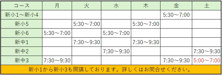 ※ 土曜の5時から7時に行われる中3入試対策は9月から2月までの間に実施する講座です。3月から8月は行われません。
